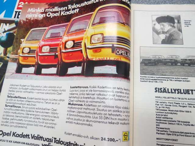 Tekniikan Maailma 1976 nr 23 Suuri autonumero, sis. mm. seur. artikkelit / kuvat / mainokset; Vertailussa Fiesta - Honda - Fiat - Renault - VW - Peugeot - Datsun,