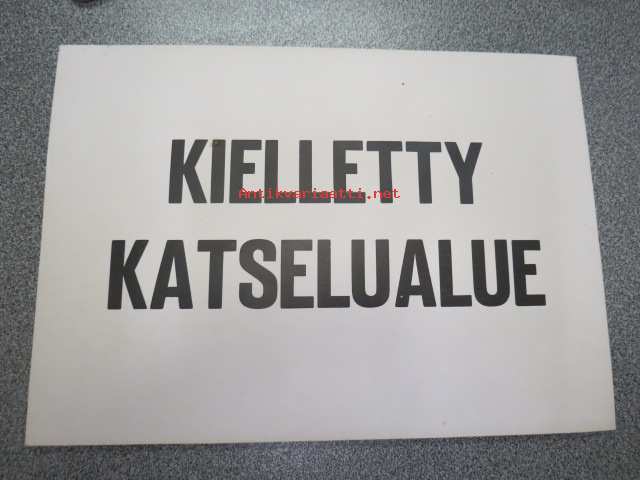Kielletty katselualue -rallikilpailujen opaskyltti 1970-luvulta, kartonkia