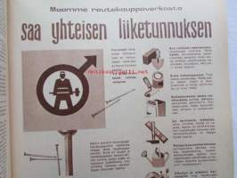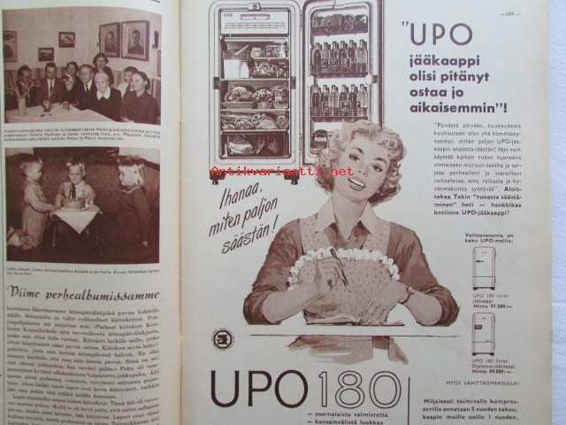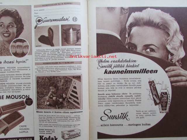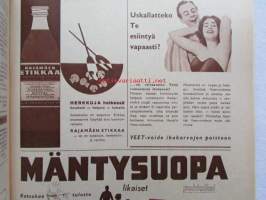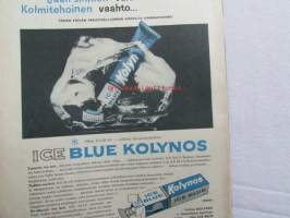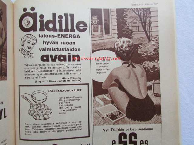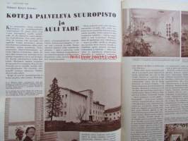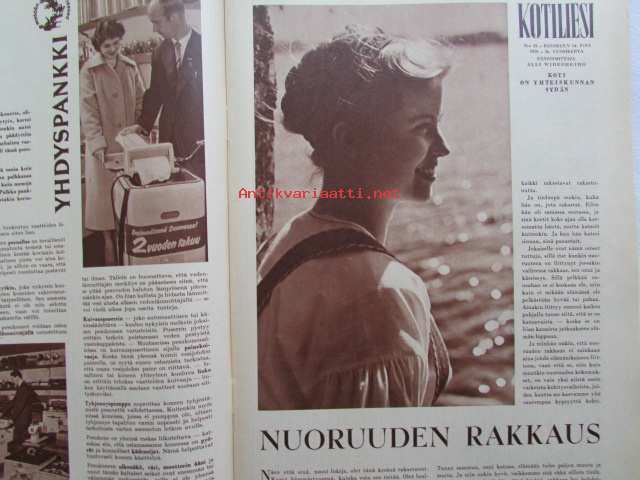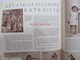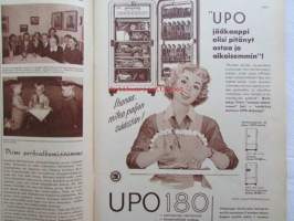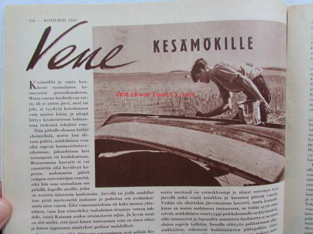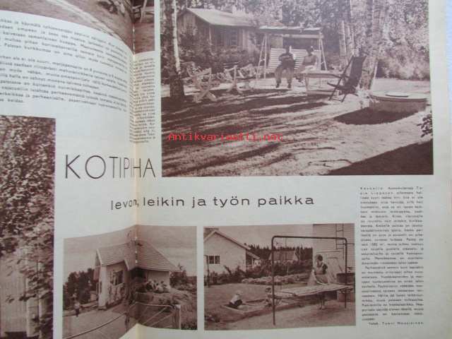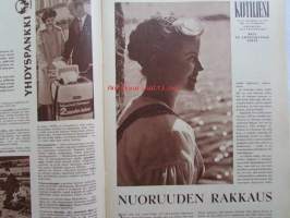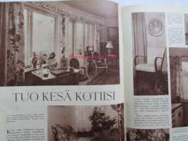 Kotiliesi 1958 nr 18 Kesäkuu 1958, Kansikuva Suomen lipun nosto, Kotipiha levon leikin ja työn paikka, Vene kesämökille, Koteja palveleva suuropisto ja Auli Tare