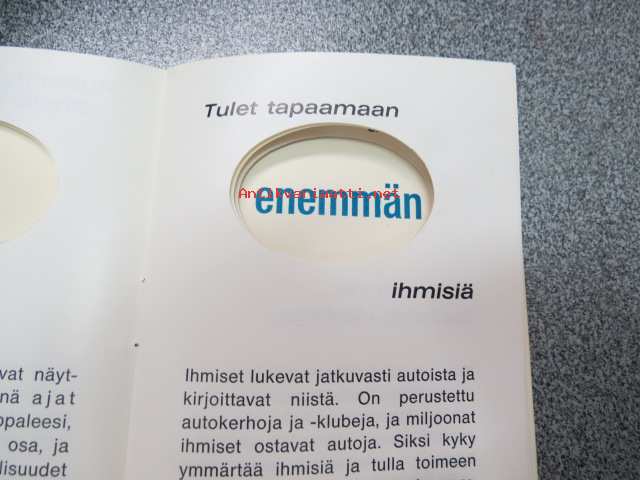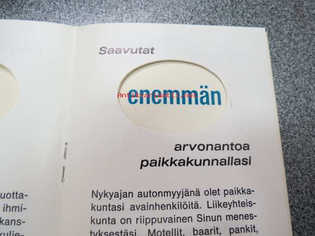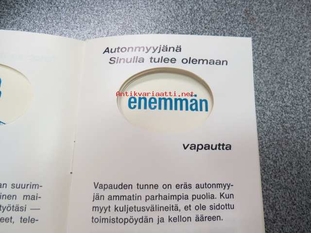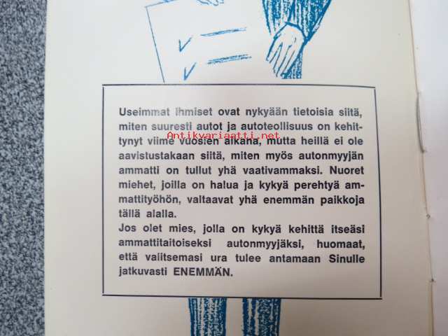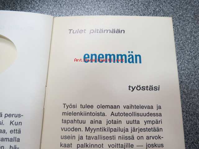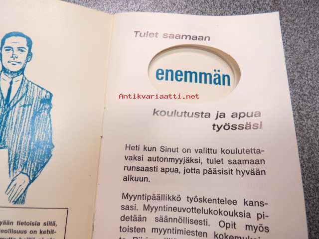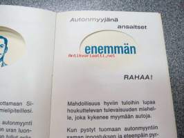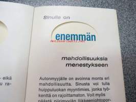 Ammattimaisen automyyjän ura / GM uraopas, sis. mm. seuraavaa; Tulet saamaan eenmmän kolulutusta ja apua työssäsi, Automyyjänä sinulla tulee olemaan enemmän vapautta, Tulet tapaamaan enemään ihmisiä, Saavutat enemmän arvonantoa paikkakunnallasi, Autonmyyjänä ansaitset enemmän rahaa, Sinulla on enemmän mahdollisuuksia menestykseen, Tulet pitämään enemmän työstäsi ("Edellämainituista syistä autonmyynti on saavuttanut todellisen uran luonteen ja autonmyyjästä on tullut eräs paikkakunnan tärkeimpiä henkilöitä")