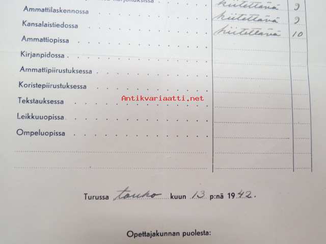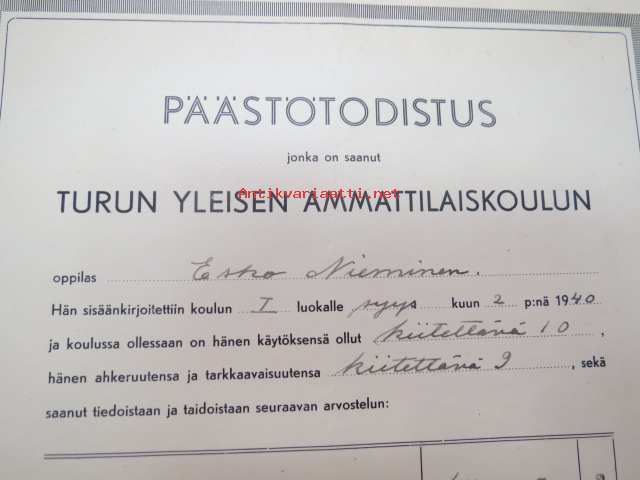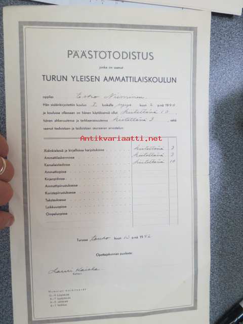 Päästötodistus, Turun yleinen ammattilaiskoulu, Esko Nieminen 1942