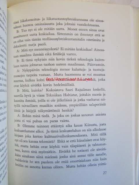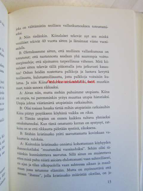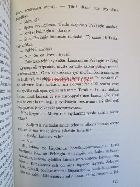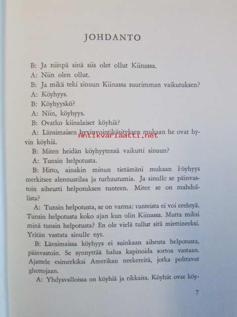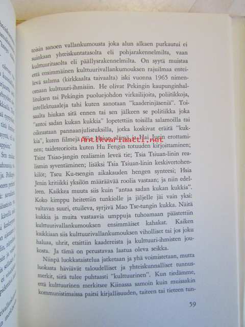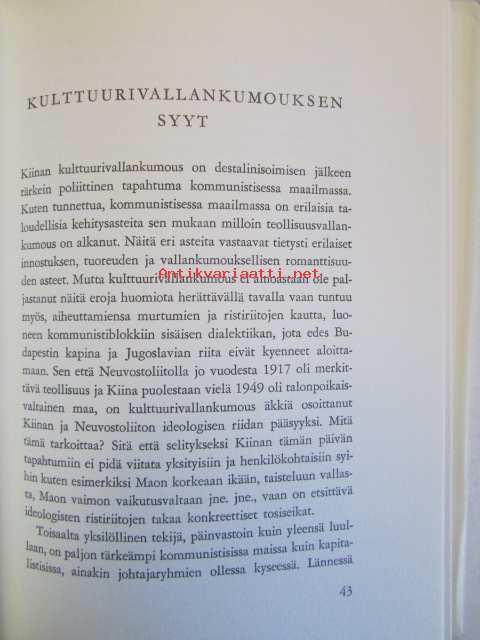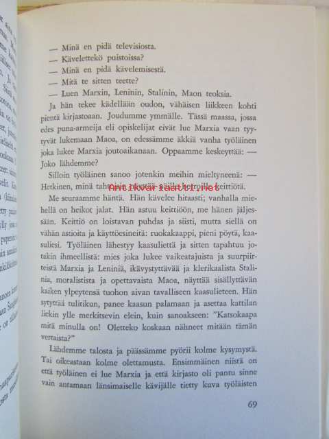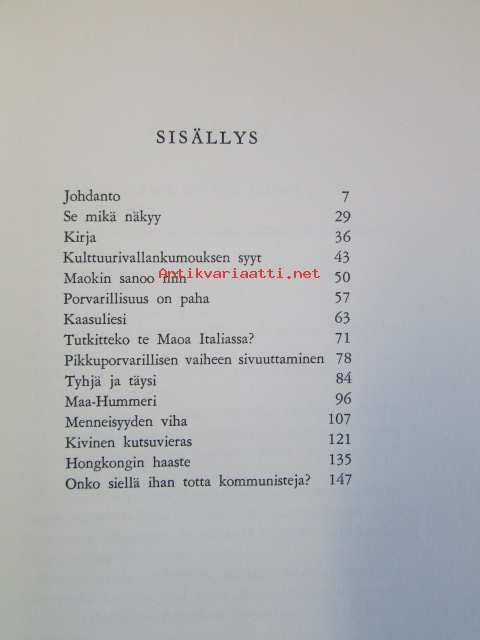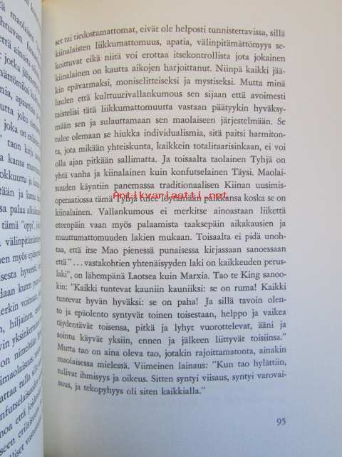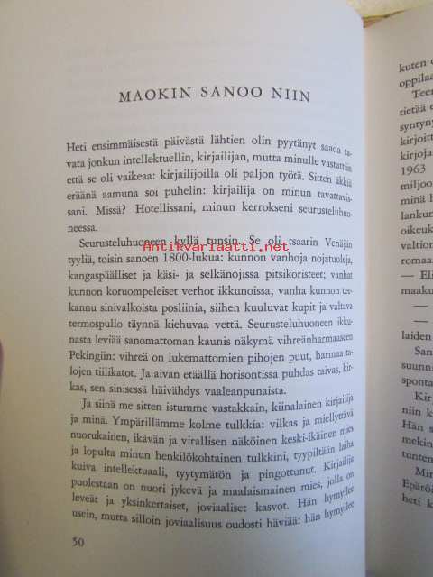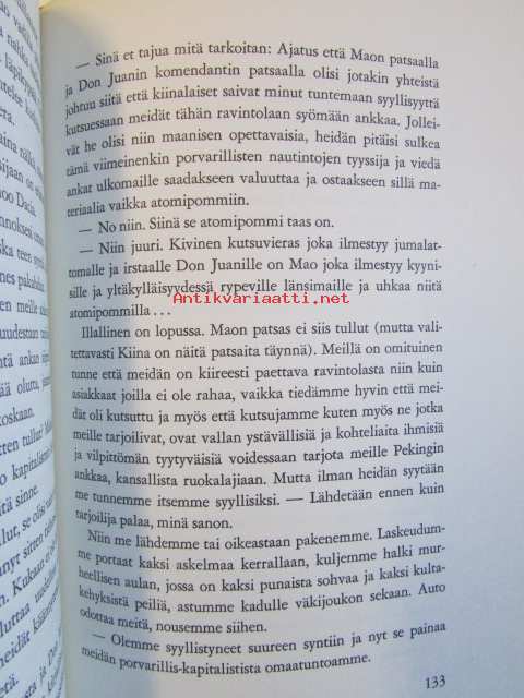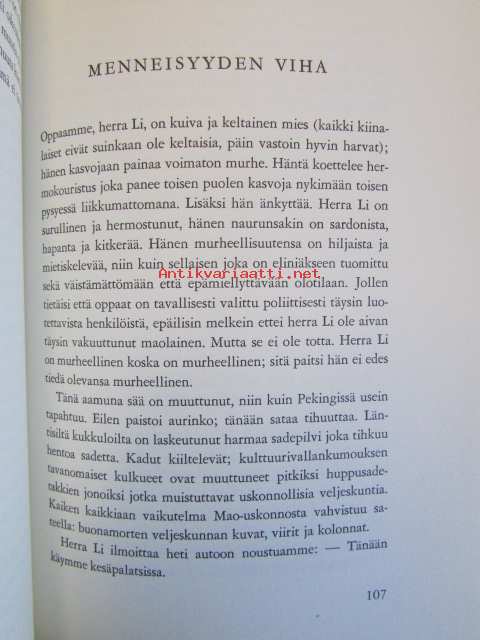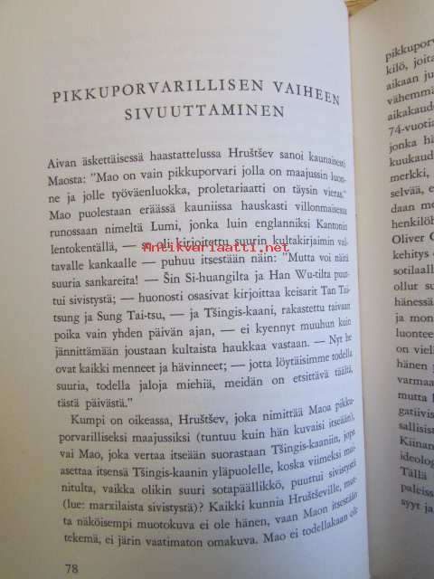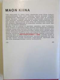 Takakansi: Tältä etäisyydeltä on vaikea saada objektiivista kuvaa Kiinan kulttuurivallankumouksesta. Siksi onkin kiintoisaa tutustua kuuluisan kirjailijan asenteettomaan näkemykseen nyky-Kiinasta. Maon Kiina on innoittanut Alberto Moraviaa. Terävästi hän analysoi näkemyksiään yhteiskunnasta, jossa köyhyyttä, moraalista puhtautta ja ihmisten yhdenvertaisuutta pidetään itsestään selvinä asioina, sekä vertaa sitä länsimaiseen sivistykseen, jota leimaavat yltäkylläisyyden ja omanvoiton tavoittelu sekä seksin käyttäminen lievittävänä lääkkeenä. Moravian kirja on analyysi ja reportaasi, paljastava, usein huvittavakin. Aivan verraton on esimerkiksi hänen sanainen kaksintaistleunsa kiinalaisen kirjailijan kanssa sekä käyntinsä Pekingin ainoassa jäljellä olevassa ravintolassa, jossa hän syvän syyllisyydentunteen vallassa nauttii ylellisen ankkaaterian. Kiinalaisten täydellinen oman menneisyytensä kieltäminen ja vihansekainen halveksunta kaikkea länsimaista kohtaan, valtaisat joukkomielenosoitukset Maon punaisia kirjoja heilutellen - näiden ilmiöiden taustaa ja merkitystä Moravia valottaa monitahoisesti. Iskevässä tekstissään hän koettaa edes hieman horjuttaa länsimaista omahyväisyyttä, taipumusta pitää vain omia aikaansaannoksiaan ainoina hyväksyttävinä.