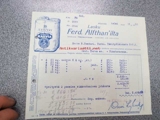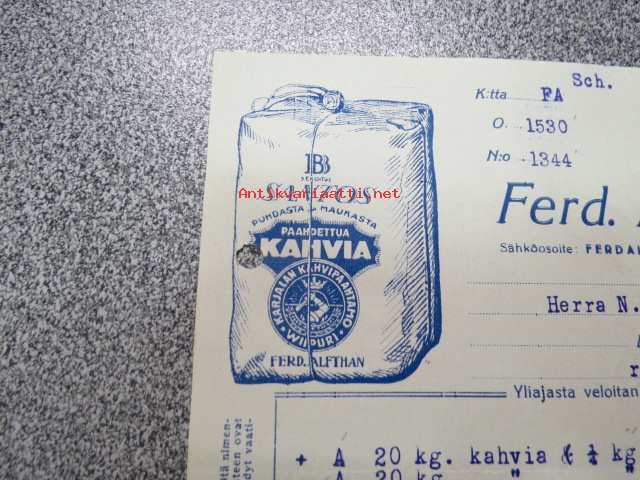Ferd. Alfthan, Viipuri 13.2.1930 -asiakirja (Santos-kahvi-logo)