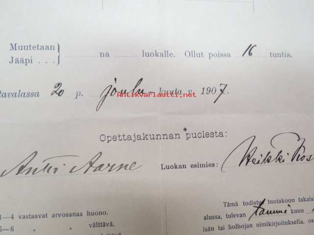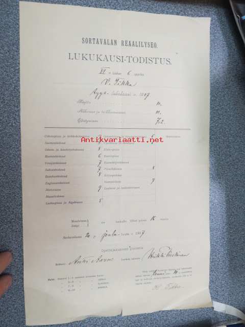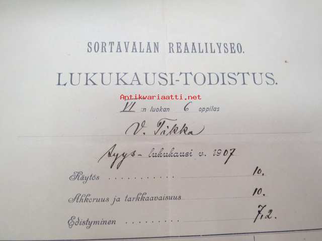 Sortavalan Reaalilyseo, lukukausi-todistus Vilho Tikka 1907