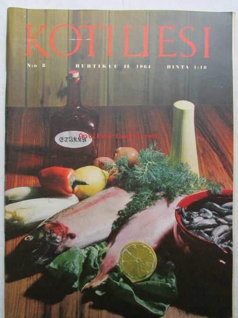 Kotiliesi 1964 nr 8 -mm. Trikooteollisuuden kevättä ja kesää, Sigyn Alenius Tanskalaisen perheen harrastehuone, Erillinen lukio unohdettu koulumuoto, Gastronomin elinkustannukset, Anjoviskala, Kalakeitto kasvisten kera, Keitetyt kalanseläkkeet, Paistetut kalaleikkeet, Katso kuvista tarkempi sisältö ja mainoskuvat.21 x 29 cm.