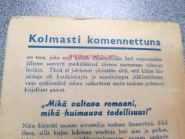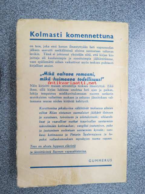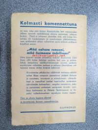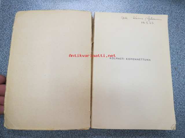 | Saatavilla | 1 kpl | | Julkaisuvuosi | 1938 | | Sivuja | 319 | | Painos | 2. | | Kunto | K2 | | Kulunut | | Sidonta/painoasu | Nidottu (pehmeäk.) | | Kielet | Suomi |