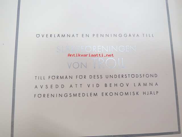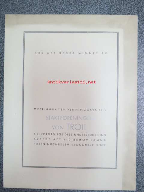 För att hedra minnet av ... överlämnat en penninggfåva till släktföreningen von Troil till förmån för dess understödsfond avsedd att vid behov lämna föreningsmedlem ekonomisk hjälp -kunniakirja, käyttämätön