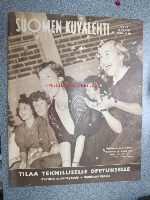 Suomen Kuvalehti 1954 nr 43, 23.10.1954, sis. mm. seur. artikkelit / kuvat / mainokset; Kansikuva Nahkakonventin riemua, Täysosuma karamellit, Lapin maalari Eino Saarnio, Enso-Gutzeit / Erkki Tanttu, Maestro Traviata radio, Tilaa teknilliselle opetukselle, Autojen paraati, Tämän päivän Tallinna, Suomalainen sotaseikkailija 1 000 vuoden takaa, Taivalkoski Horsmavaara, Rataa asemanväli vuodessa, Ula ASA 820, Oxygenol, Ketterästi polkee Faari - Faarilla on Jaguaari, Sirius käkikello, Heteka, Hellas 505, ym.