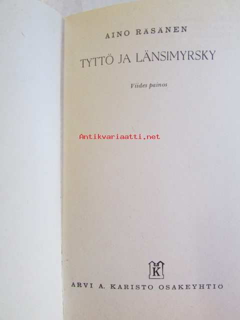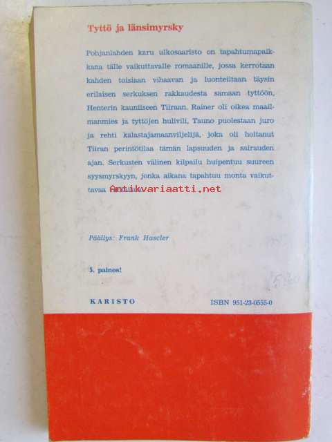 | Saatavilla | 1 kpl | | Julkaisuvuosi | 1972 | | Sivuja | 164 | | Painos | 5. | | Kunto | K2 | | Sidonta/painoasu | Nidottu (pehmeäk.) | | ISBN | 951-23-0555-0 | | Kielet | Suomi |