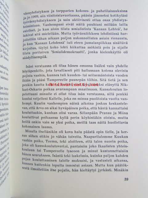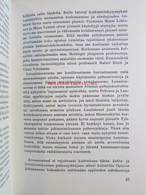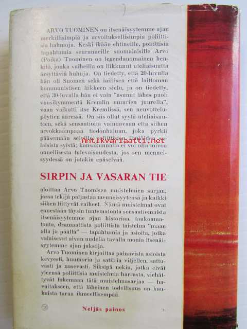 | Saatavilla | 1 kpl | | Julkaisuvuosi | 1956 | | Sivuja | 314 | | Painos | 4. | | Kunto | K3 | | Kansipaperi K2 | | Sidonta/painoasu | Sidottu (kansipaperit) | | Kielet | Suomi |