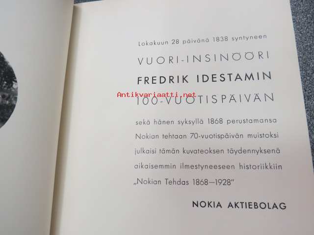 Nokia Aktiebolag -kuvateos, täydennysjulkaisu teokseen "Nokian Tehdas 1868-1928", kauppaneuvos Fredrik Idestamin syntymän satavuotismuistoksi toimitettu