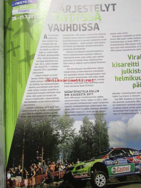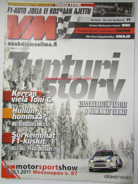 Vauhdin Maailma 2011 nr 1 -mm. Jussi HOnka Ski-Doo MXZ 600 RS:n, F1 Toyota TF110, Artic Lappland Tally, Jarmo Mahonen, Mr Enduro Juha Salminen Husqvarna, Emmi kimiläinen, Abarth 500 Assetto Corsen, Lotus Indiapolissa, Nissan Micra Kit Car ja Suzuki Ignis V1600,, Katso kuvista tarkempi sisältö.