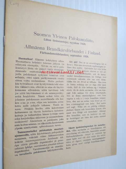 Suomen Yleinen Palokuntaliitto liiton tiedonantoja syyskuu 1929 / Allmänna Brandkårsförbundet i Finland förbundsmeddelanden semptember 1929