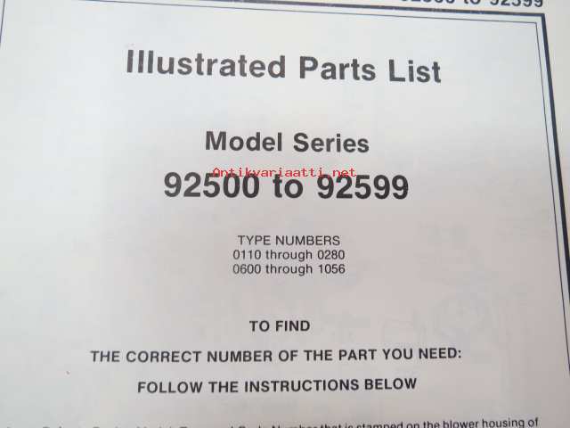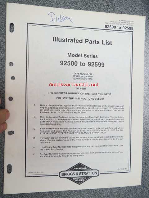 Briggs & Stratton Illustrated Parts List Model Series 92500 to 92599 varaosaluettelo, tyypit näkyvät kuvissa