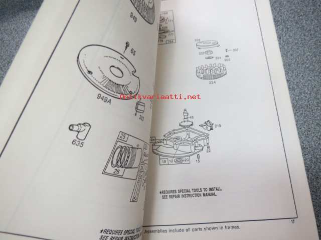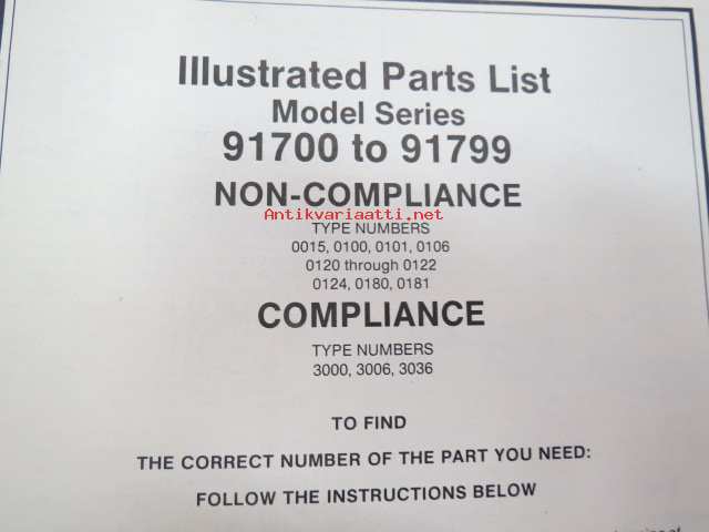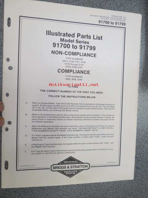Briggs & Stratton Illustrated Parts List Model Series 91700 to 91799 varaosaluettelo, tyypit näkyvät kuvissa