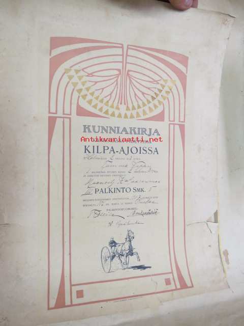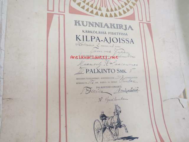Kunniakirja Kärkölässä pidetyistä kilpa-ajoissa 2.2.1913 tamma "Vappu", omistaja maanviljelijä K. Saarenmaa, III palkinto