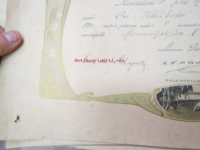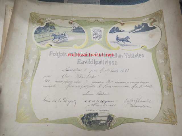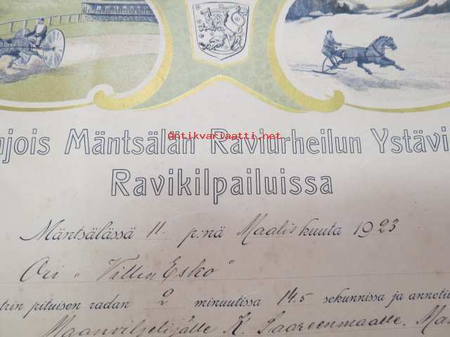 Pohjois-Mäntsälän Raviurheilun Ystävien Ravikilpailuissa 11.3.1923 ori "Willen-Esko", omistaja maanviljelijä K. Saarenmaa, II palkinto -kunniakirja,