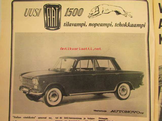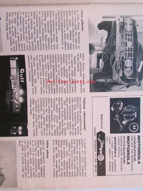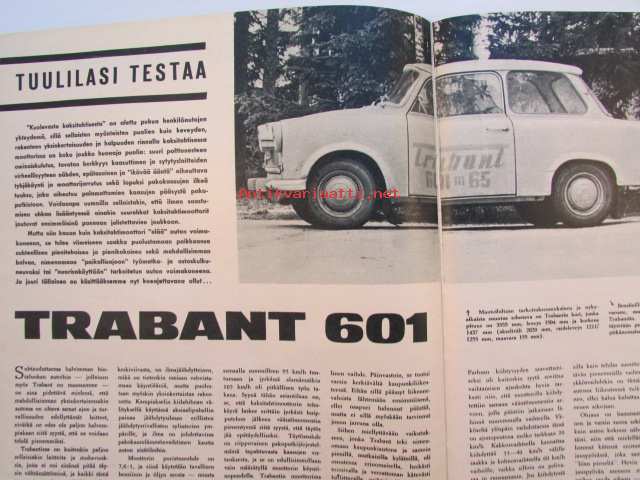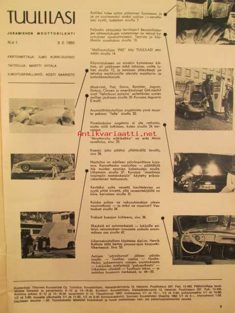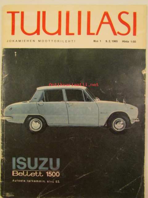 Tuulilasi 1965 nr 1 -mm. Kannessa Isuzu Bellet 1500, Tuulilasin testissä Trabant 601, Veneentekijä, Helmikuun autoja Citroen DS 19 Pallas, Jaquar Mark 2 ja Mark 10, Simca coupe 1000 ja 1500 Break, Fiat 1500, Moskvitsh 408, katso kuvista tarkempi sisältö.21 x 29 cm.