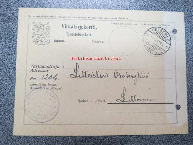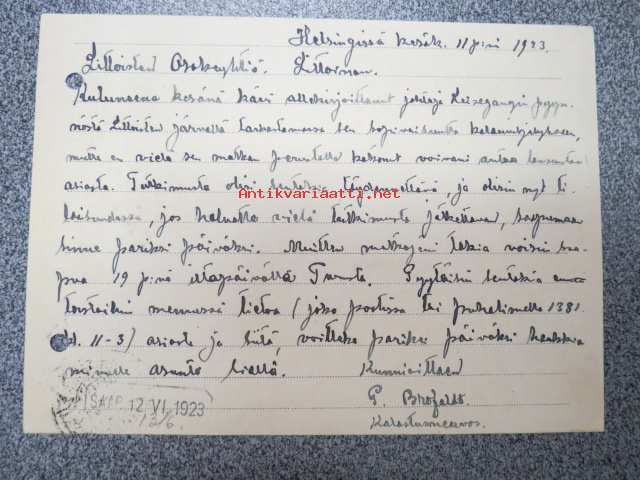 Kalastusneuvos G. Brofeldt / Littoinen Oy 11.6.1923 -kirjekortti virkapostina koskien Littoistenjärven mahdollisuuksia kalanviljelyyn, omakätinen allekirjoitus