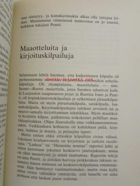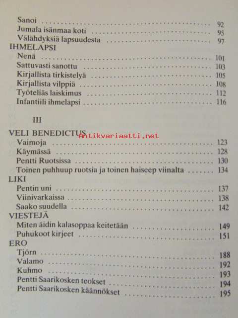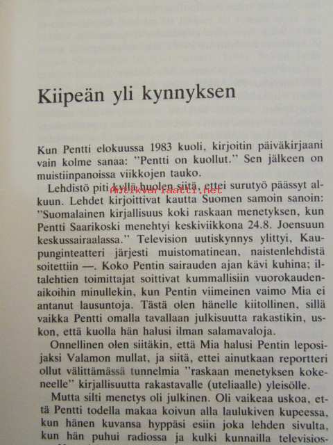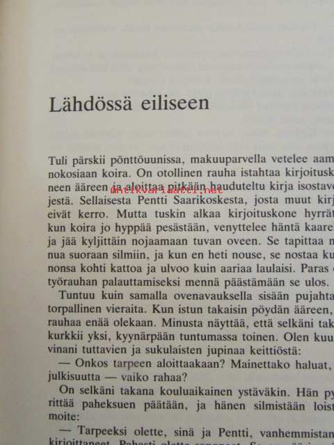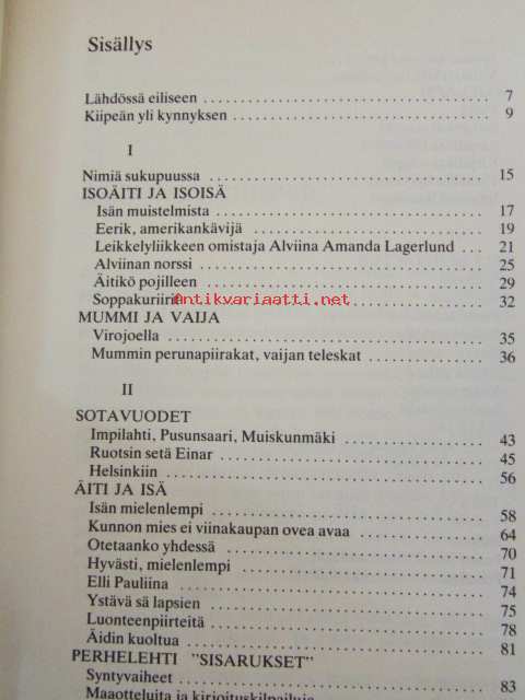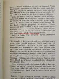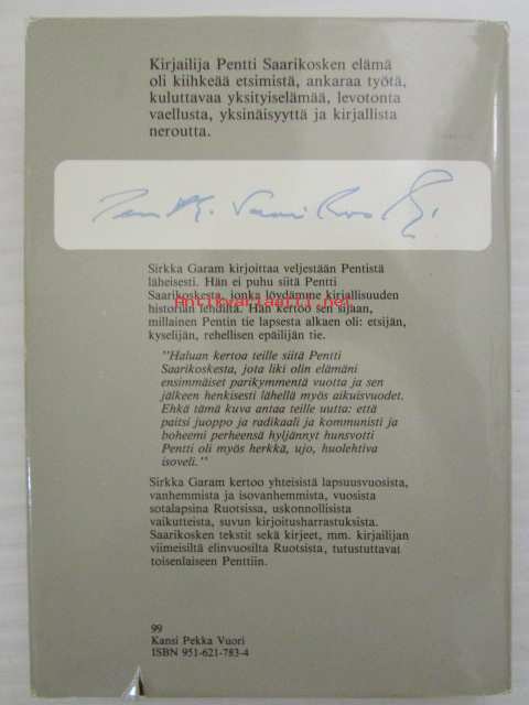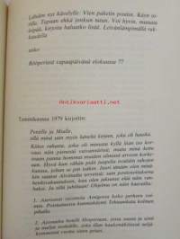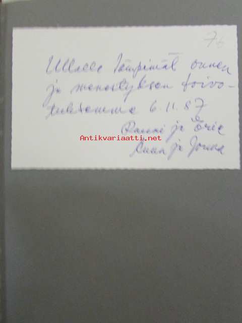 | Saatavilla | 1 kpl | | Julkaisuvuosi | 1987 | | Sivuja | 196 | | Painos | 1 | | Kunto | K3 | | Onnittelukirjoitus erillisellä lapulla ekalla tyhjällä sivulla, katso kuvasta. | | Sidonta/painoasu | Sidottu (kansipaperit) | | ISBN | 951-621-783-4 | | Kielet | Suomi |