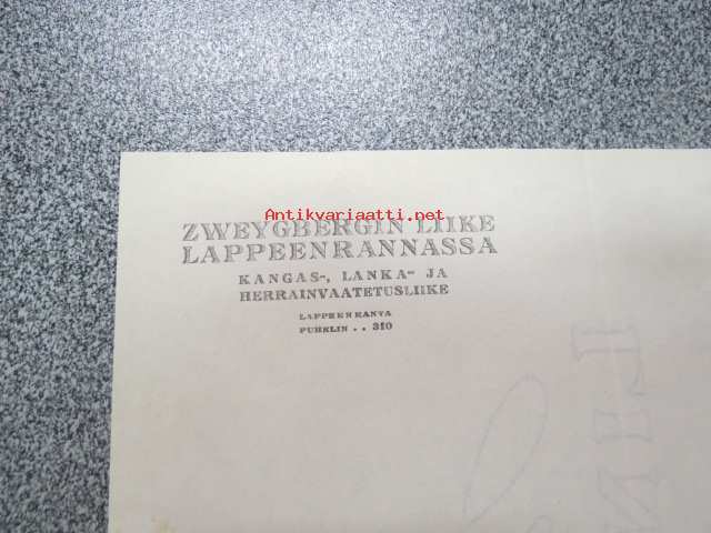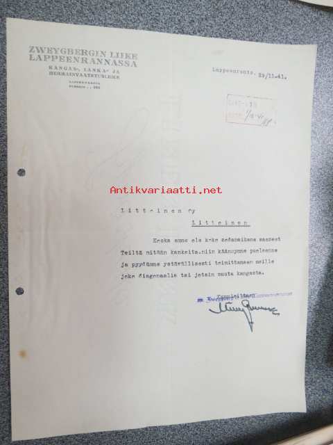 Zweygbergin Liike Lappeenrannassa, 29.11.1941 -asiakirja