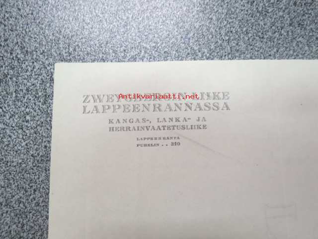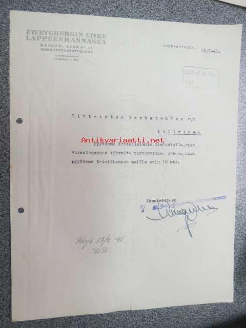 Zweygbergin Liike Lappeenrannassa, 15.2.1941 -asiakirja