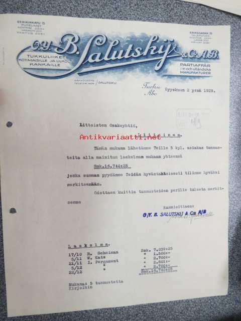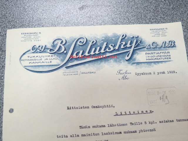 Oy B. Salutskij & Co Ab, Turku, 2.9.1929 -asiakirja