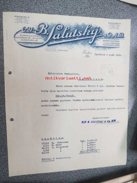 Oy B. Salutskij & Co Ab, Turku, 2.11.1929 -asiakirja