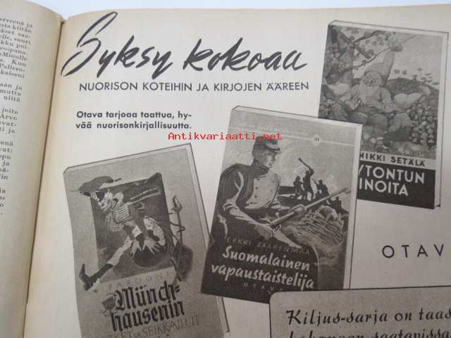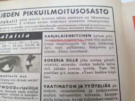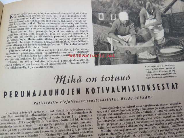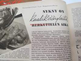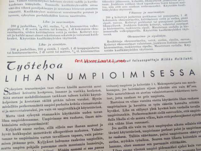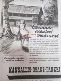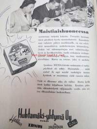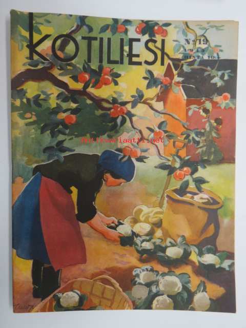 Kotiliesi 1945 nr 19, Kansikuva Martta Wendelin (nainen kerää syksyn satoa) Askon Tehtaat - Lahti, Huhtamäki-yhtymä Oy maistiaishuone. Ajankuvaa syksy 1945