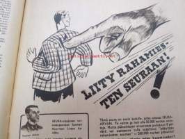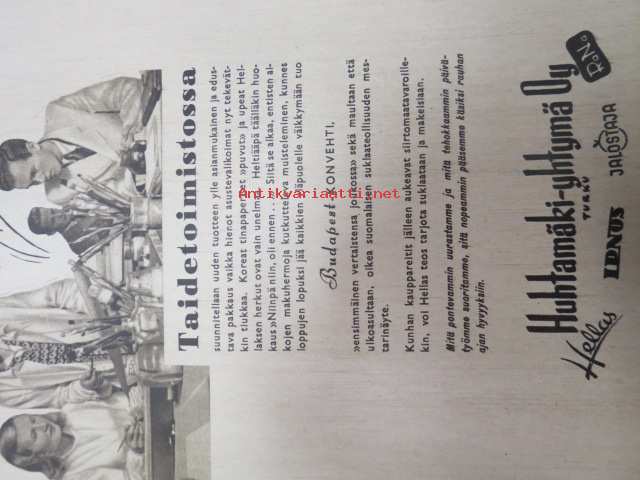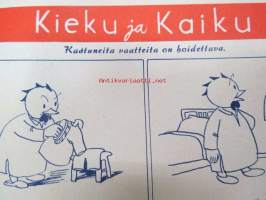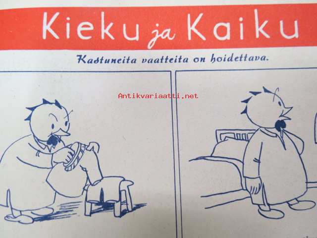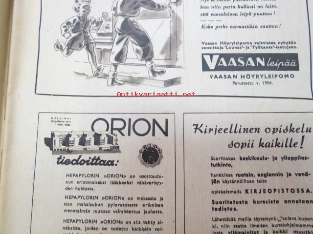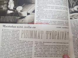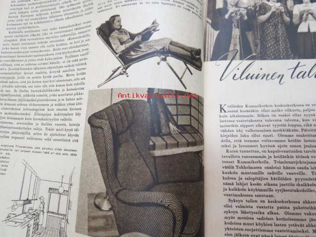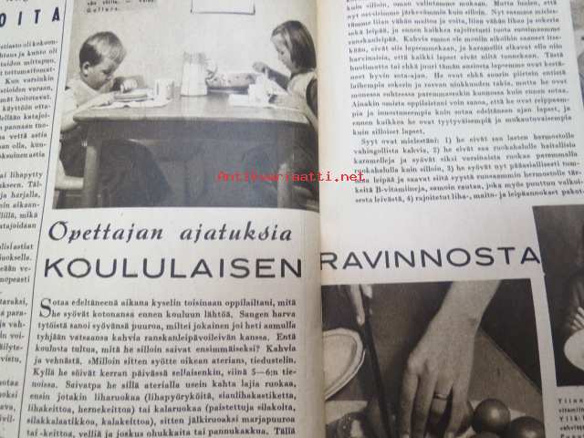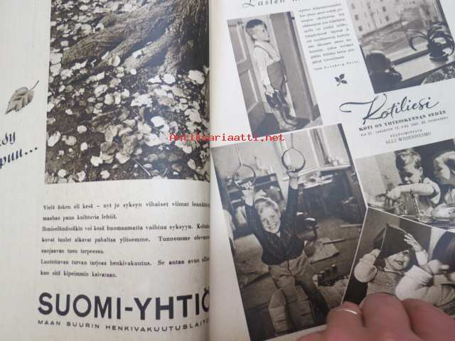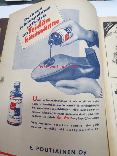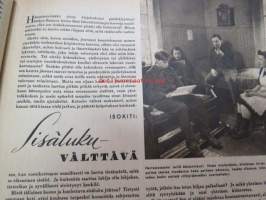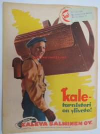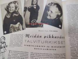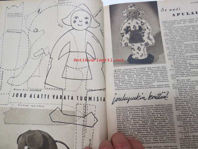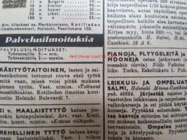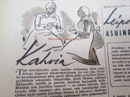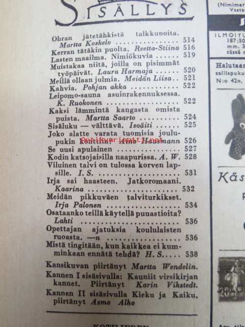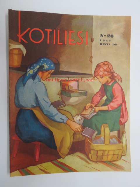 Kotiliesi 1945 nr 20, sis. mm. seur. artikkelit / kuvat / mainokset; Kansikuva Martta Wendelin, Kas-Kas kengänpohjavoide, Ohran jätetähkistä talkkunoita, Kerran tätäkin puolta - vanhapiika, Huhtamäki-yhtymä Oy Taidetoimisto, Muistakaa niitä joilla on pisimmät työpäivät, Kahvia, Leipomo-Sauna asuinrakennuksessa, Martta Saarto - kaksi lämmintä kangasta omista puista, Sisäluku - välttävä, Joko alatte varata tuomisia joulupukin konttiin? - pehmolelukaavoja, Kodin katsojaisilla naapurissa, Viluinen talvi on tulossa korven lapsille, Meidän pikkuväen talviturkikset - turkislakkien ja -kauluksien kotivalmistus, Kolulaisen ravinto, Kieku ja Kaiku, Kaleva Salminen Oy Kale-tornisteri koululaukku, ym.21 x 29 cm.