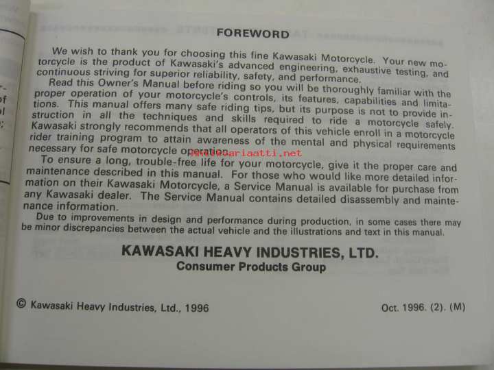 Kawasaki Heavy Industries Ltd, 1996Omistajan käsikirja englanniksi.