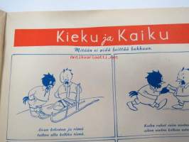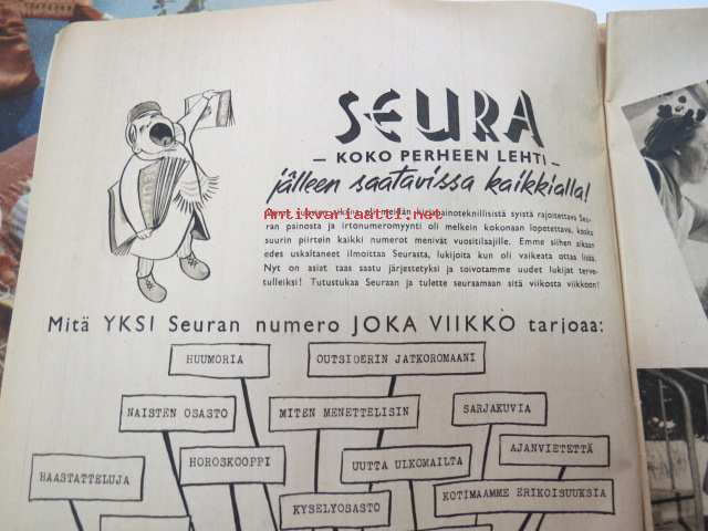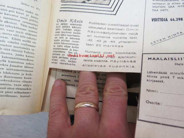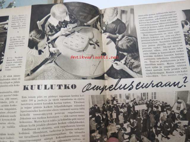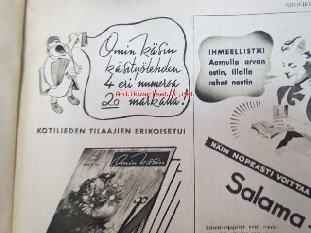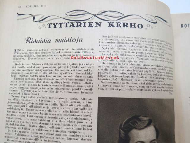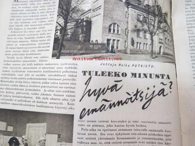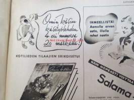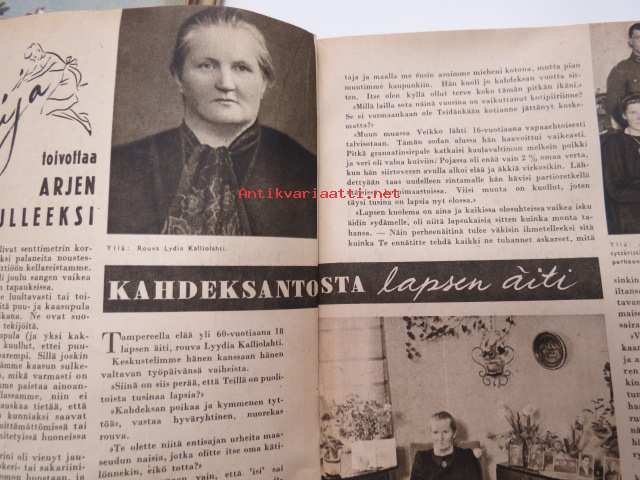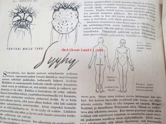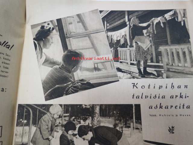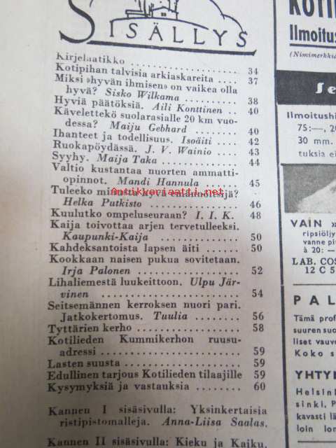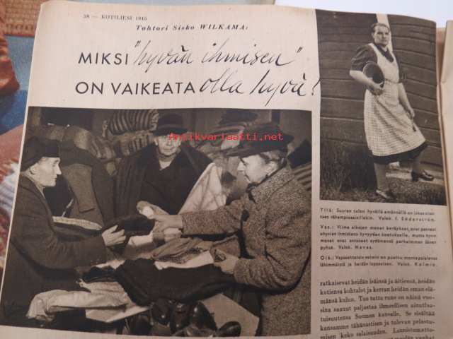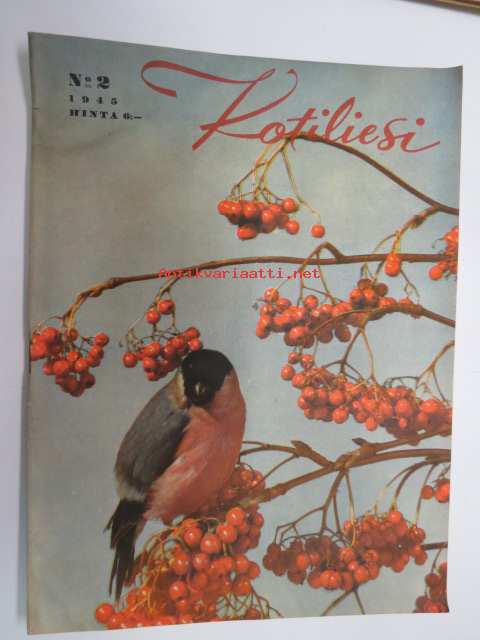 Kotiliesi 1945 nr 2, sis. mm. seur. artikkelit / kuvat / mainokset; Kansikuva sommitellut Doris Bengström, "Omenankorjuu" ja "Satulaiva" ristipistomallit, Miksi hyvän ihmisen on vaikeata olla hyvä?, Syyhy, Valtio kustantaa nuorten ammattiopinnot, Tuleeko minusta hyvä emännöitsijä?, Kuulutko ompeluseuraan?, Khdeksantoista lapsen äiti rouva Lyydia Kalliolahti Tampere, Kookkaan naisen pukua sovitetaan, Lihaliemestä luukeittoon, Tyttärien kerho, Kieku ja Kaiku, ym.21 x 29 cm.