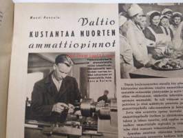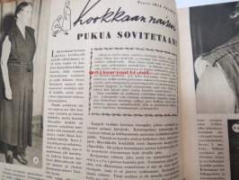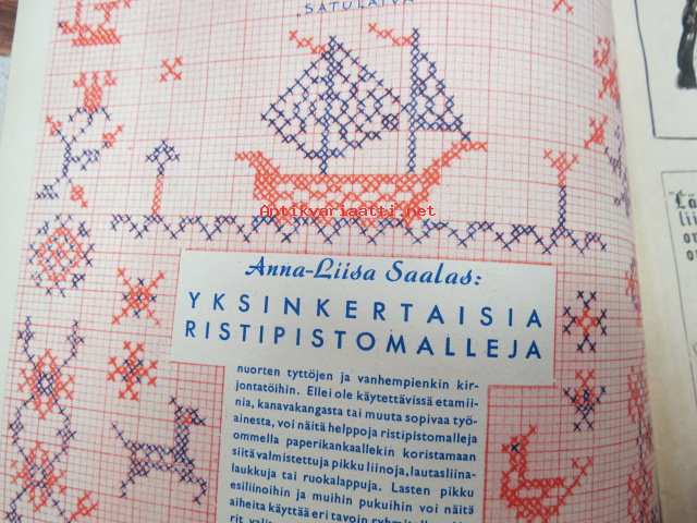 Kotiliesi 1945 nr 2, sis. mm. seur. artikkelit / kuvat / mainokset; Kansikuva sommitellut Doris Bengström, "Omenankorjuu" ja "Satulaiva" ristipistomallit