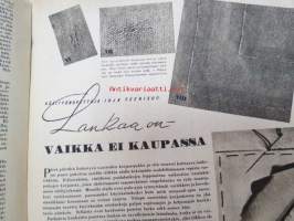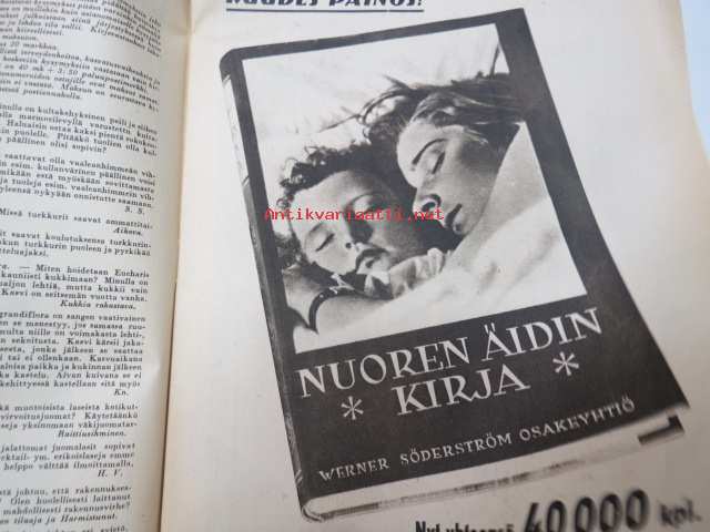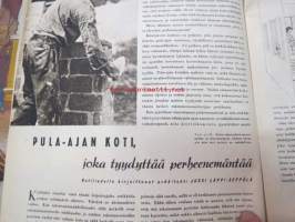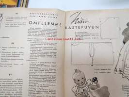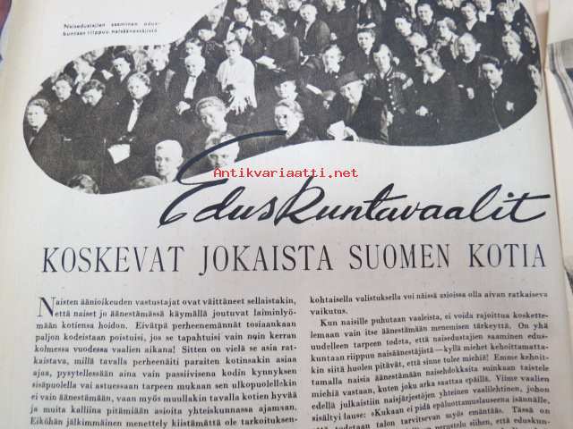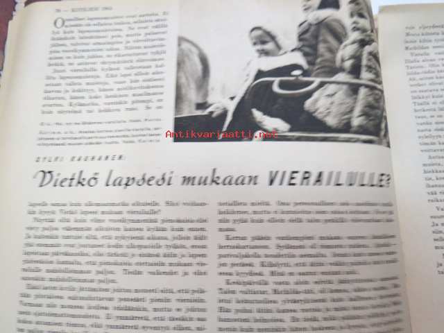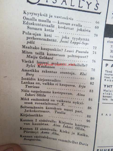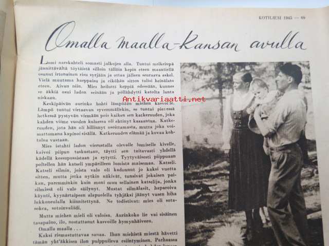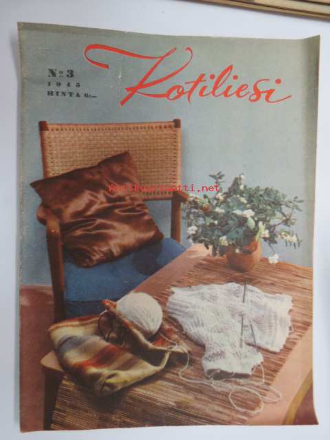 Kotiliesi 1945 nr 3, sis. mm. seur. artikkelit / kuvat / mainokset; Kansikuva sommitellut Doris Bengström, Kastemekon kirjontamalli, Eduskuntavaalit koskevat jokaista Suomen kotia, Pula-ajan koti joka tyydyttää perheenemäntää, Maaltako kaupunkiin?, Miten teillä kannetaan polttopuut?, Vietkö lapsesi muikaan vierailulle?, Amerikka rakentaa asuntoja, Lankaa on - vaikka ei kaupassa, Näin ompelemme kastepuvun, Kieku ja Kaiku, ym.21 x 29 cm.