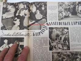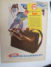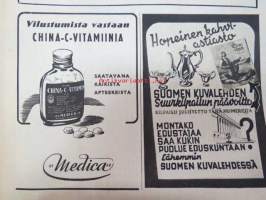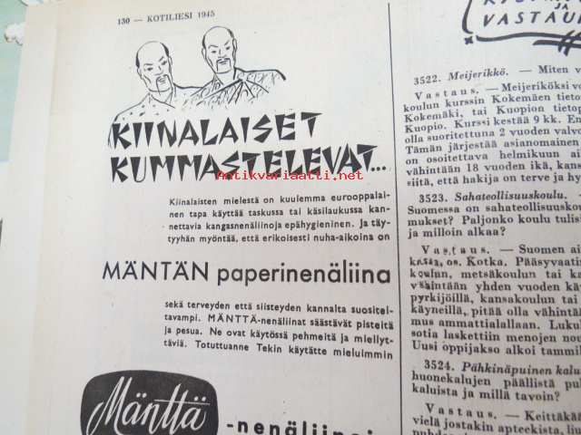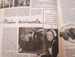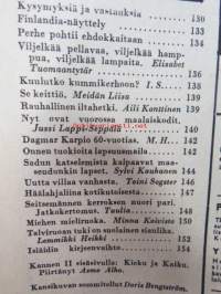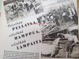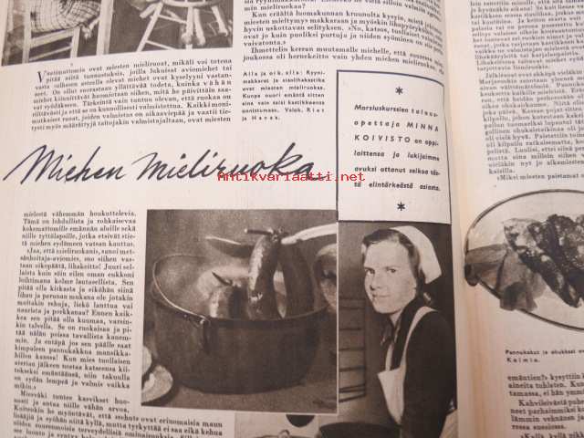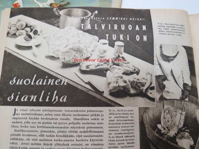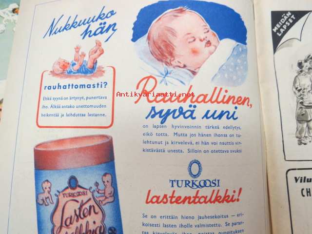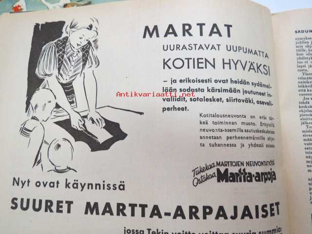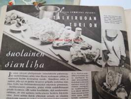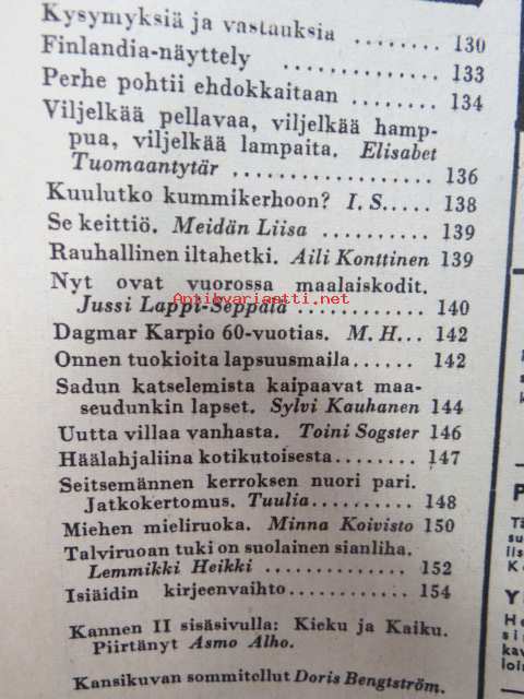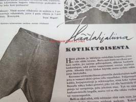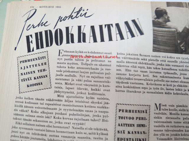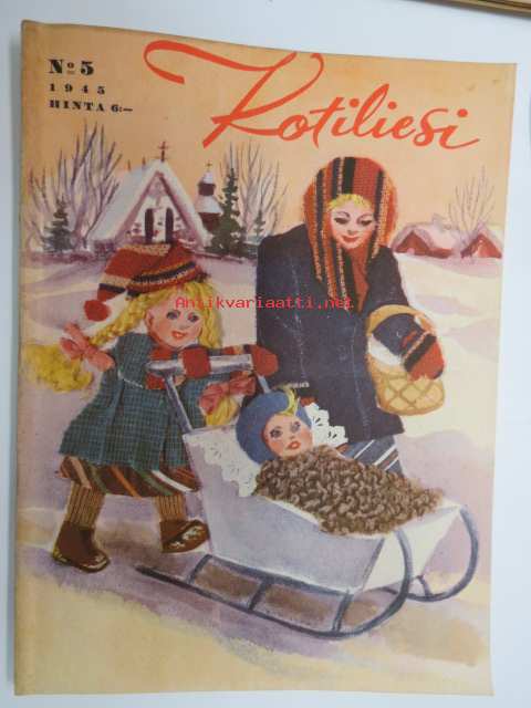 Kotiliesi 1945 nr 5, Maaliskuu 1945 sis. mm. seur. artikkelit / kuvat / mainokset; Kansikuva sommitellut Doris Bengström, Perhe pohtii ehdokkaitaan, Kuulutko kummikerhjoon, Maalaiskodit ( pohjapiirroksia) Onnen tuokioita lapsuusmailta, Uutta villaa vanhasta, Miehen mieliruoka, Martta-arpajaiset, Kieku ja Kaiku, ym. Takakannessa värikäs Kaleva Salminen OY:n koululaukkumainos.21 x 29 cm.
