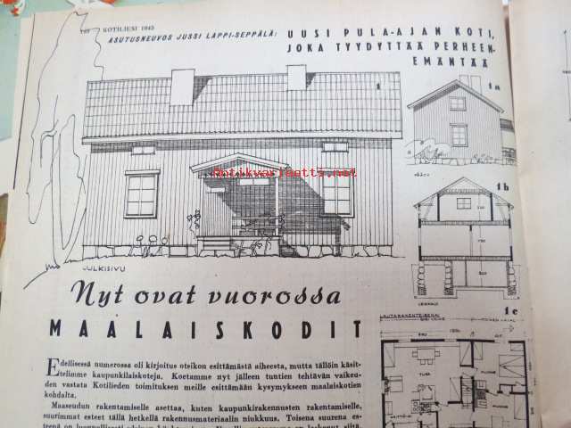 Kotiliesi 1945 nr 5, Maaliskuu 1945 sis. mm. seur. artikkelit / kuvat / mainokset; Kansikuva sommitellut Doris Bengström, Pula-ajan talon mallipiirros