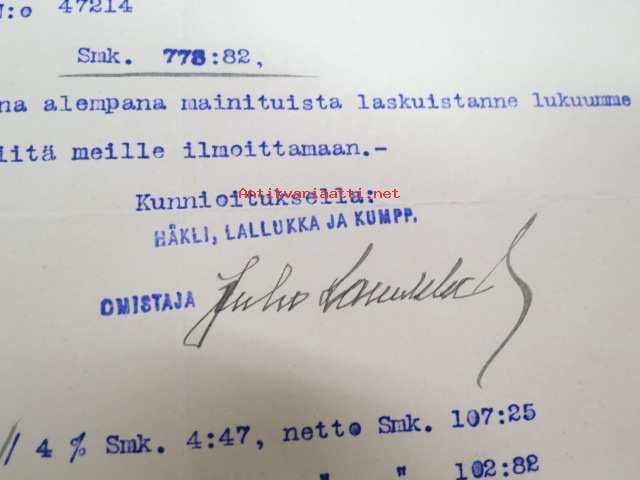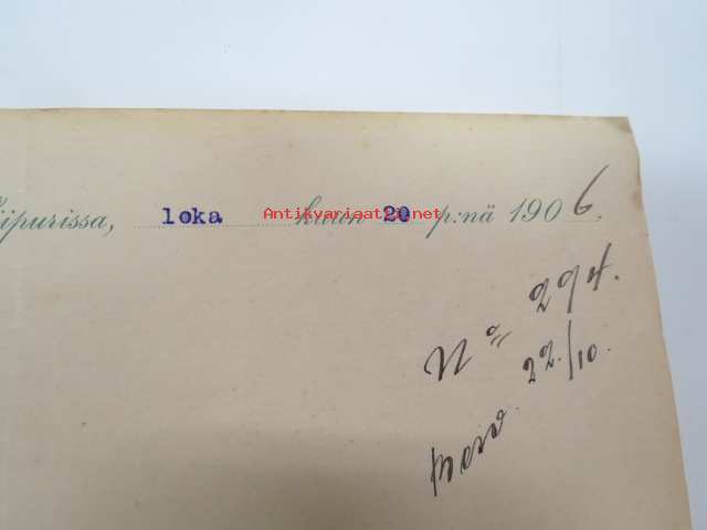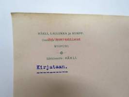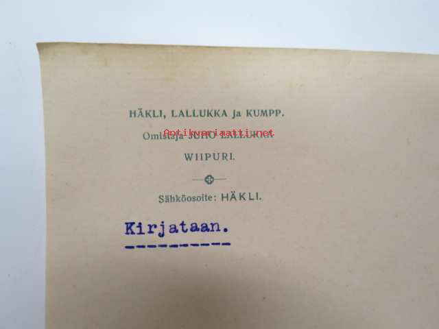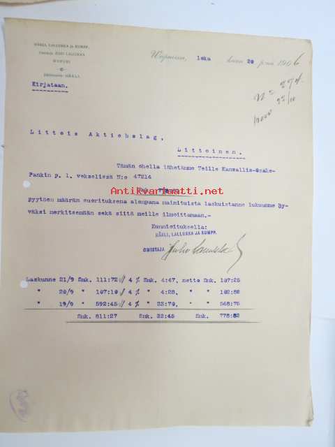 Häkli, Lallukka ja Kumpp Oy, Viipuri 20.10.1906 -asiakirja, omakätinen allekirjoitus Juho Lallukka