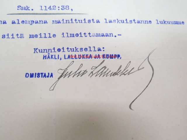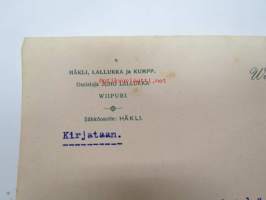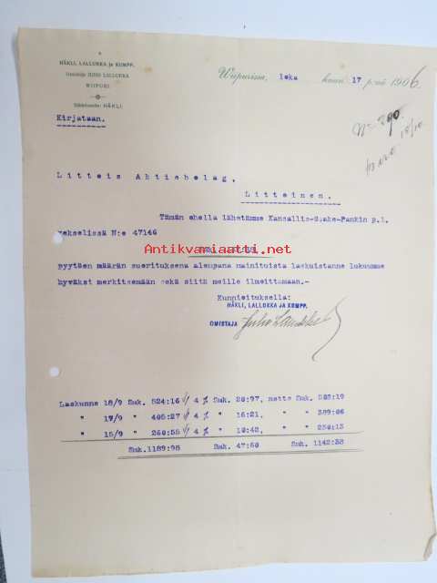 Häkli, Lallukka ja Kumpp Oy, Viipuri 17.10.1906 -asiakirja, omakätinen allekirjoitus Juho Lallukka