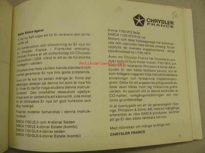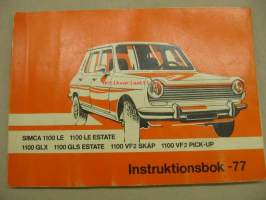 Simca 1100LE, Estate 1100GLX 1100GLS Estate 1100VF2 Skåp 1100 VF2 Pick-Up -käyttöohjekirja