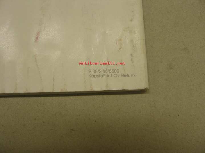 | Saatavilla | 1 kpl | | Julkaisuvuosi | 1988 | | Sivuja | 80 | | Kunto | K2 | | kulunut | | Sidonta/painoasu | Nidottu (pehmeäk.) | | Kielet | Suomi |