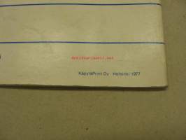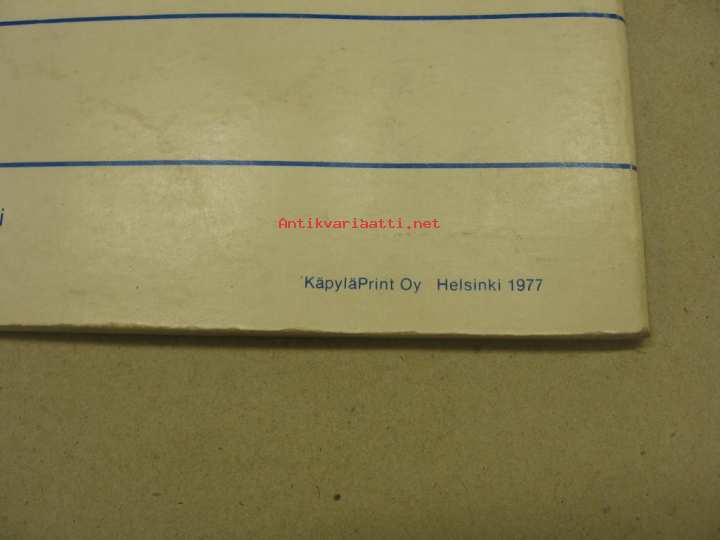 | Saatavilla | 1 kpl | | Julkaisuvuosi | 1977 | | Sivuja | 44 | | Kunto | K3 | | Sidonta/painoasu | Nidottu (pehmeäk.) | | Kielet | Suomi |