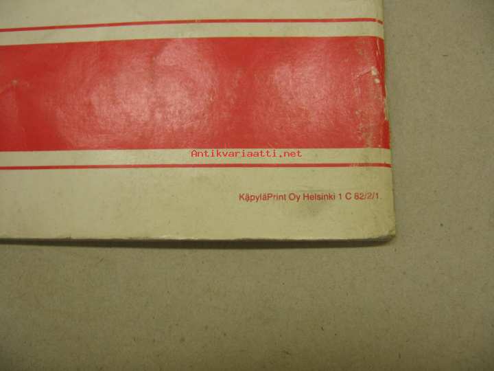 | Saatavilla | 1 kpl | | Julkaisuvuosi | 1982 | | Sivuja | 52 | | Kunto | K3 | | Sidonta/painoasu | Nidottu (pehmeäk.) | | Kielet | Suomi |