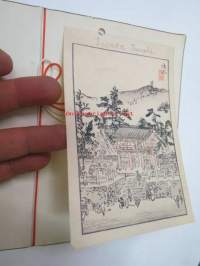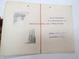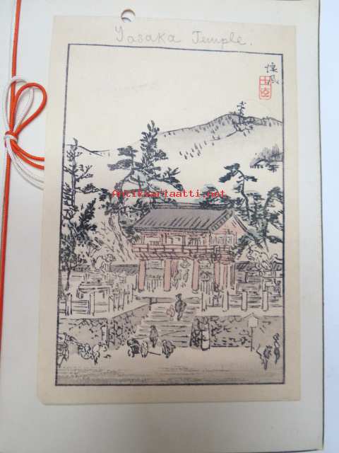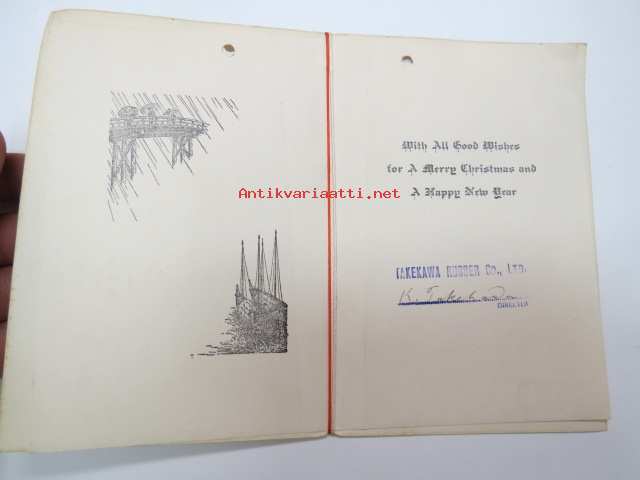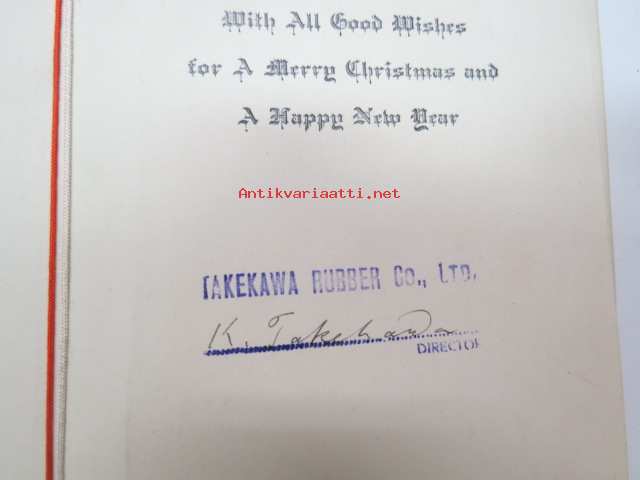 Takekawa Rubber Co. Ltd -joulutervehdys 1930-luvulta, tullut suomalaiseen teollisuuslaitokseen, allekirjoittanut K. Takekawa, painate "Yasaka Temple" kiinnitettynä taittokorttiin18 x 24 cm.