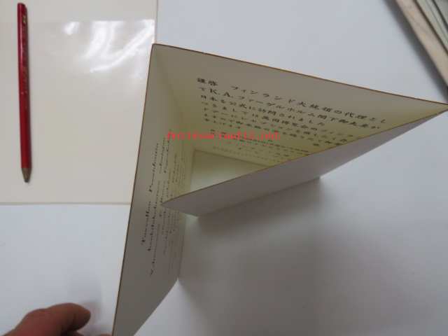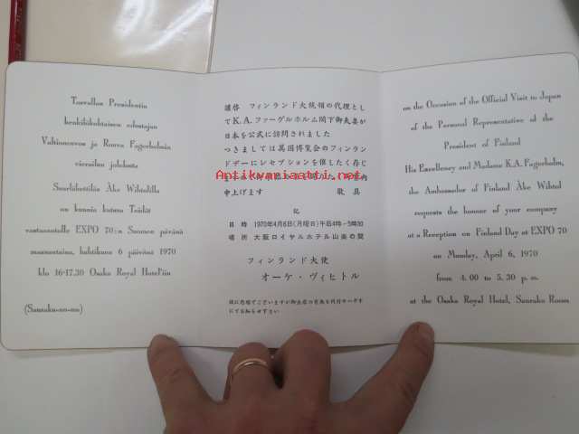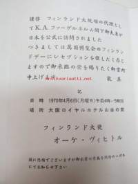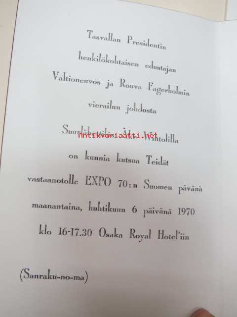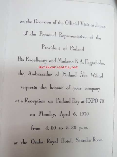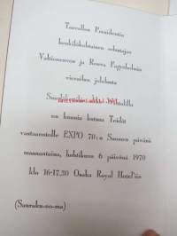 Tasaallan presidentin henkilökohtaisen edustajan Valtoneuvos ja rouva Fagerholmin vierailun johdosta Suurlähettiläs Åke Wihtolilla on kunnia kutsua Teidät vastaanotolle EXPO 70:n Suomen päivänä... Osaka RoyalHotel´iin... -kutsukortti suomen, japanin ja englannin kielellä