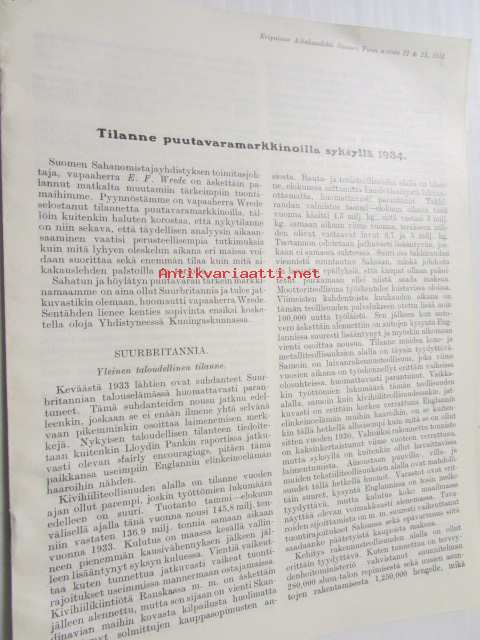 Tilanne puutavaramarkkinoilla syksyllä 1934, eripainos Suomen Puun nr 22 & 23 1934