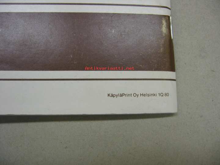 | Saatavilla | 1 kpl | | Julkaisuvuosi | 1980 | | Sivuja | 67 | | Kunto | K3 | | Sidonta/painoasu | Nidottu (pehmeäk.) | | Kielet | Suomi |