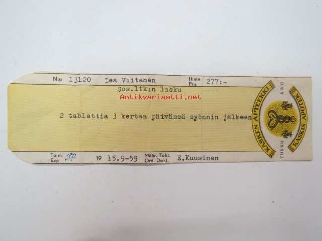 Kasken Apteekki / Kaskis Apotek 15.9.1959 -apteekkisignatuuri