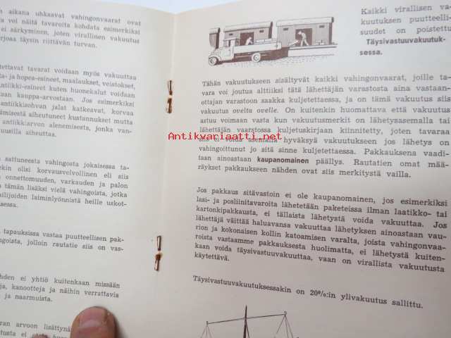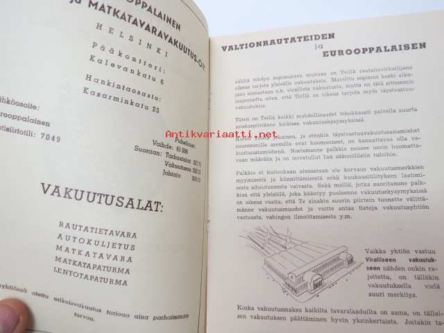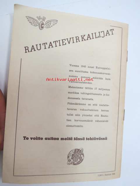 Vakuuttamalla autamme itseämme ja toisia - Rautatietavaravakuutuksella autamme tämän lisäksi Valtionrautateitä -myyntiesite tarkoitettu ainoastaan VR:n virkailijoille, jotka toimivat asiamiehinä "Eurooppalainen Tavara- ja matkavakuutus Oy:lle"