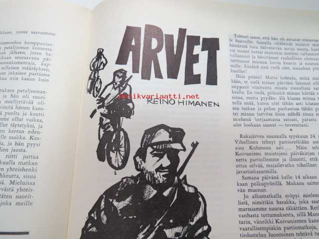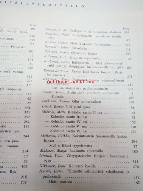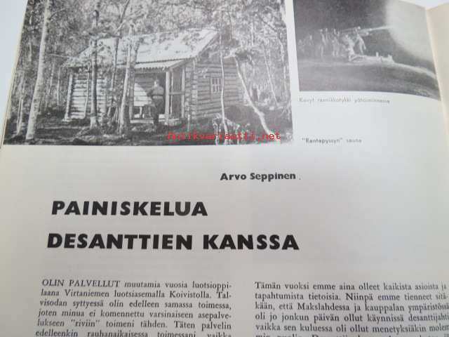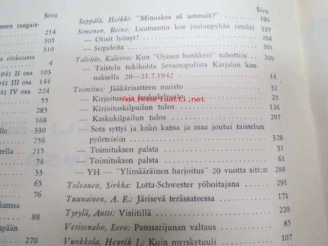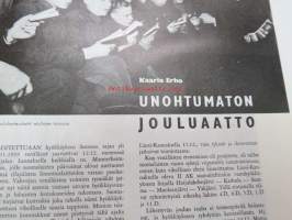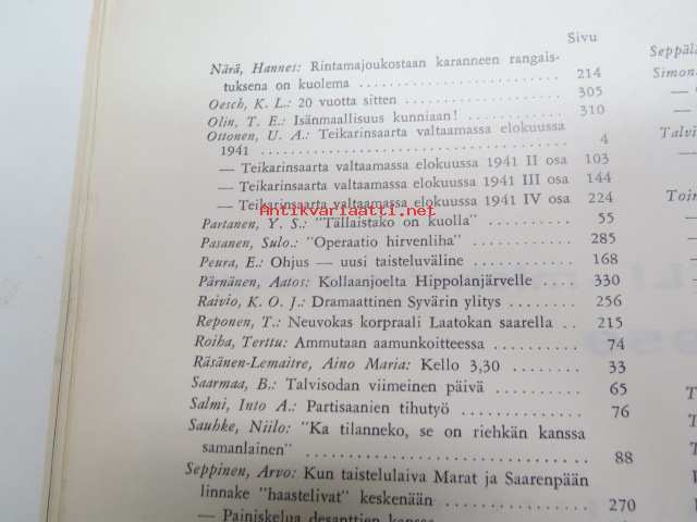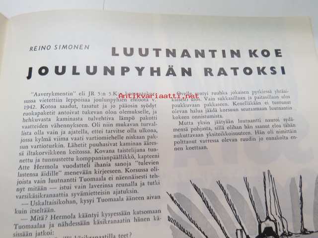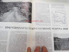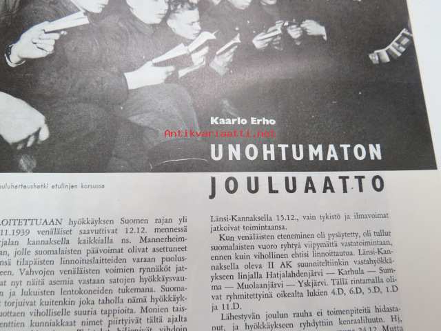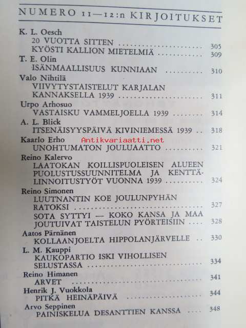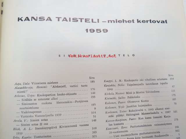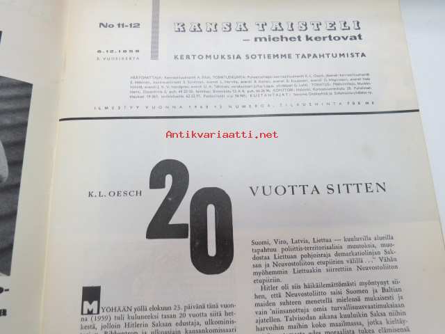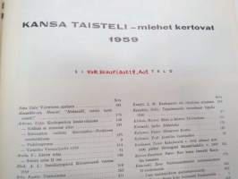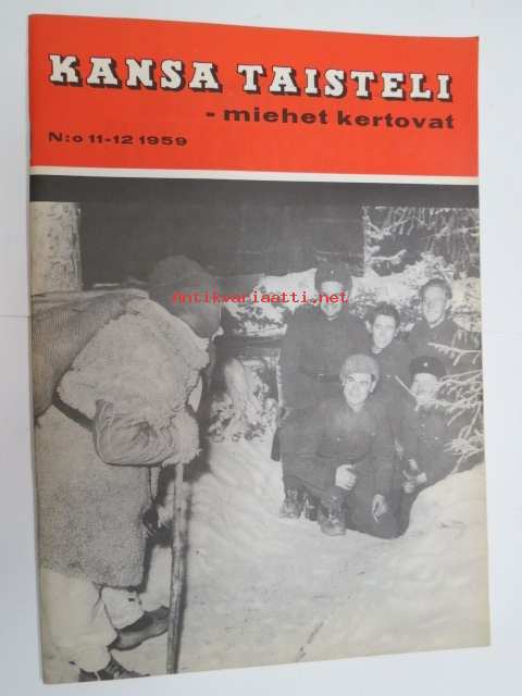 Kansa Taisteli 1959 nr 11-12, sis. mm. seur. artikkelit; Valo Nihtilä - Viivytystaistelut Kannaksella 1939, Urho Arhosuo - Vastaisku Vammeljoella 1939, A.L. Blick - Itsenäisyyspäivä Kiviniemessä 1939, Kaarlo Erho - Unohtumaton jouluaatto, Aatos Pärnänen - Kollaanjoelta Hippolanjärvelle, Reino Kalervo - Laatokan koillispuoleisen alueen puolustussuunnitelma ja kenttälinnoitustyöt vuonna 1939, L.M. Kauppi - Kaukopartio iski vihollisen selustassa, Reino Himanen - Arvet, Henrik J. Vuokkola - Pitkä heinäpäivä, Arvo Seppinen - Painiskelua Desanttien kanssa, ym.21 x 30 cm.
