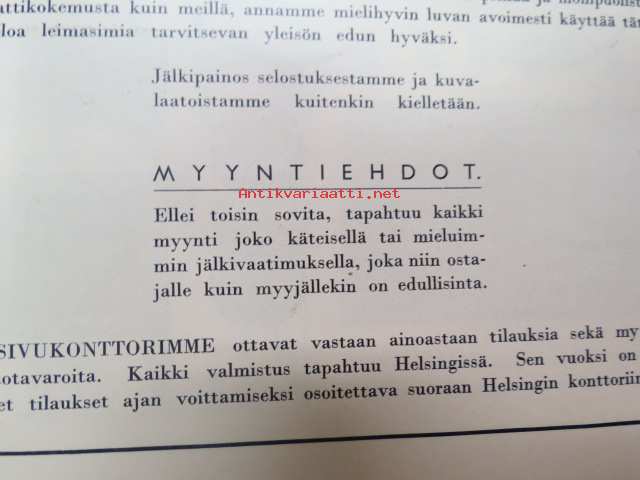 | Saatavilla | 1 kpl | | Julkaisuvuosi | 1937 | | Sivuja | 112 | | Kunto | K2 | | Sidonta/painoasu | Nidottu (pehmeäk.) | | Kielet | Suomi |